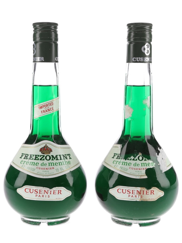 This lot contains two 34cl bottles of Cusenier Freezomint Crème de Menthe produced in France. We estimate these were bottled in the 1970s.