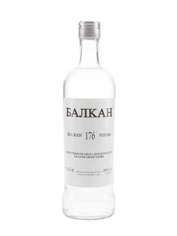 A bottle of Balkan 176 vodka, produced in Serbia and bottled at 88% ABV.