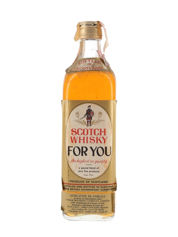 A bottle of Scotch Whisky For You, A Special Blend of Very Fine Products, produced and bottled by Tower Blending Company Limited. This was imported to Italy by DARP, we estimate in the 1970s.