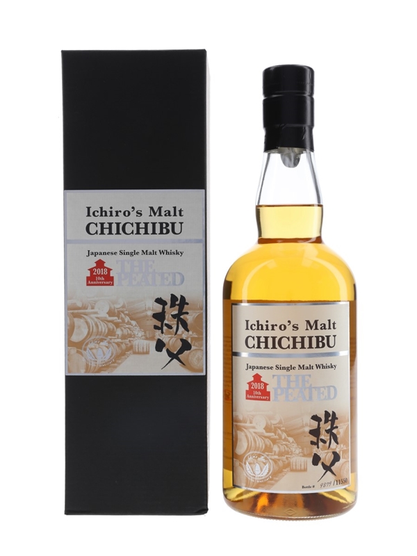 A bottle of Ichiro's Malt Chichibu The Peated Japanese single malt whisky. This was bottled to celebrate the 10th anniversary of the distillery in 2018.