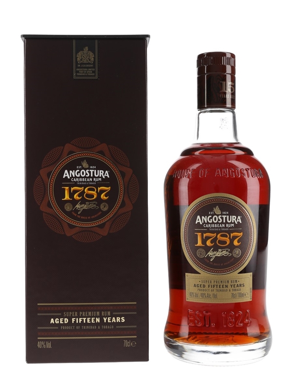 A bottle of Angostura 1787 15 Year Old Caribbean Rum, produced in Trinidad & Tobago.