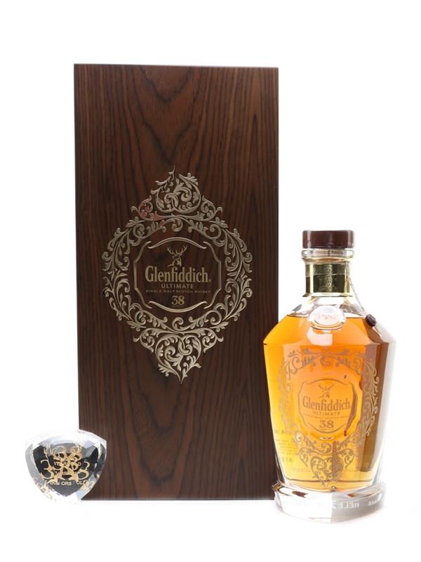 A bottle of Glenfiddich Ultimate 38 Year Old, exclusively bottled for the Chinese market. This whisky was matured in a combination of American oak barrels and European oak butts, then transferred for a further two months' maturation in Warehouse number 8. This is presented in a crystal decanter decorated with 24K gold and comes with crystal stopper in a presentation box. The bottling code indicates this was bottled in 2013.