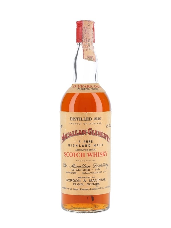 A bottle of The Macallan-Glenlivet 33 Year Old, distilled in 1940, matured in sherry casks and bottled by Gordon & MacPhail. This was imported for the Italian market by Pinerolo.