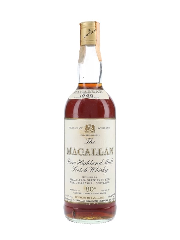 A bottle of The Macallan 1960 Single Highland Malt Scotch Whisky, matured in sherry wood and bottled by Campbell, Hope & King. This was bottled for the Italian market, and imported by Rinaldi, we estimate in the 1970s.