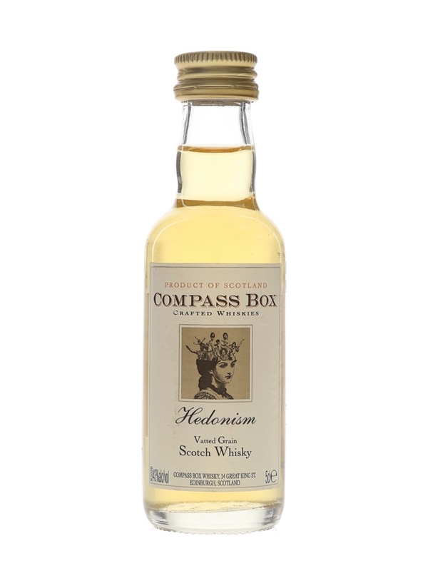 A miniature bottle of Hedonism Vatted Grain Scotch Whisky, bottled by independent bottler Compass Box. This was matured in first fill American oak casks.