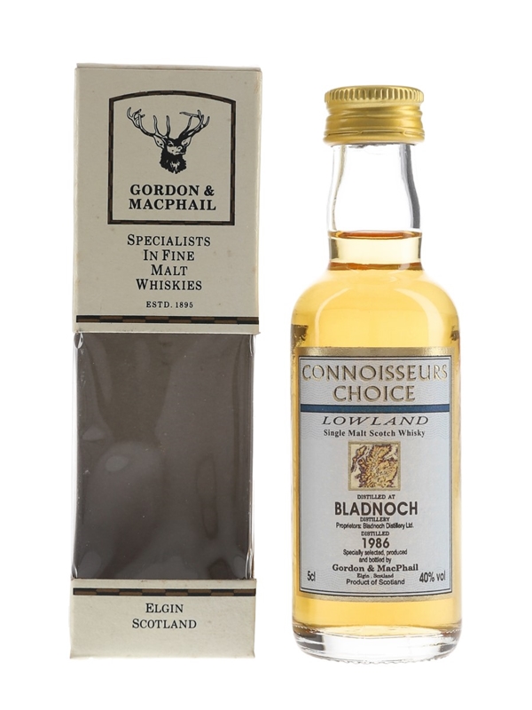 A miniature bottle of Bladnoch 1986 Lowland Single Malt Scotch Whisky. This was distilled in 1986 bottled by Gordon & MacPhail as part of the Connoisseurs Choice range. The bottling code indicates this was bottled in 1997.