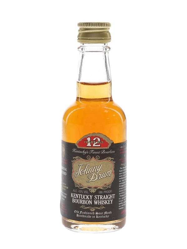 A miniature bottle of Johnny Drum 12 Year Old Kentucky Straight Bourbon Whiskey, bottled in Kentucky by Johnny Drum Distilling Company.