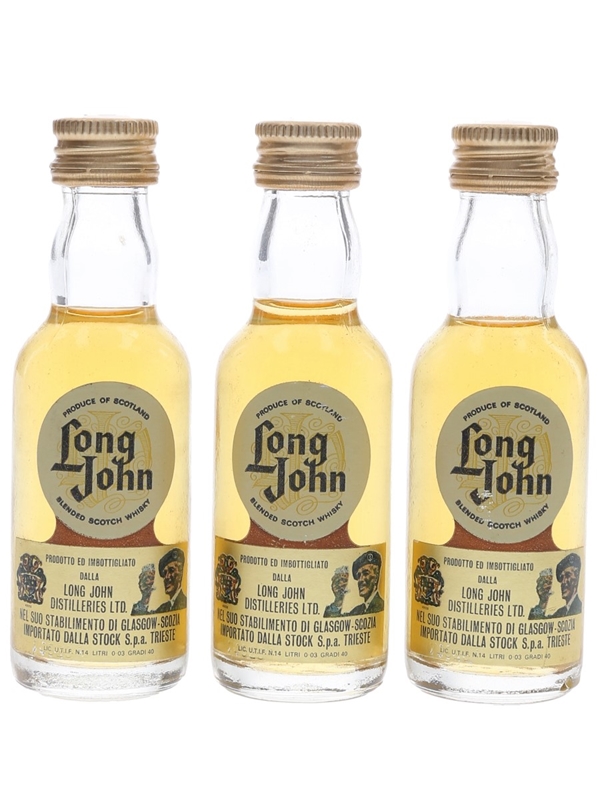 This lot contains three miniature bottles of Long John Blended Scotch Whisky. These were bottled for the Italian market and imported to Italy by Stock, we estimate in the 1970s.