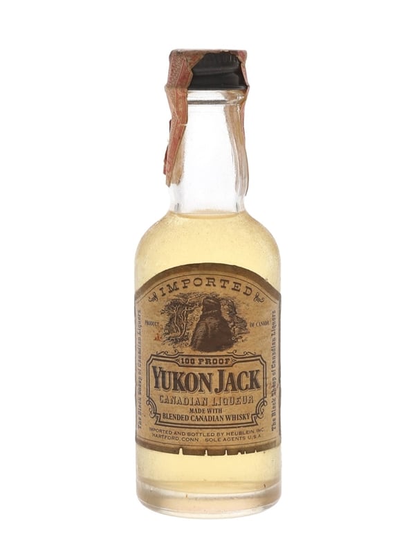 A miniature bottle of Yukon Jack Canadian Liqueur made with Canadian Whisky. This was imported and bottled by Heublein Inc., Hartford, Connecticut, we estimate in the 1990s.