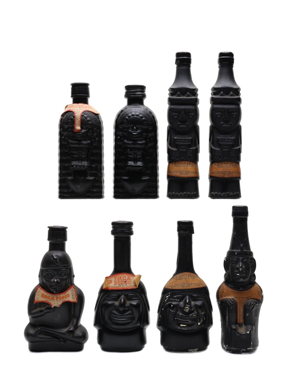 This lot contains eight minature bottles of Inca Pisco. Seven of these were produced in Italy by Riunite di Liquori under the authorisation of Mario Ranuzzi, Peru, and one was produced and bottled by DRL Spa., Solaro, Italy. Each bottle is shaped like an Inca statue. We estimate these were bottled in the 1960s to 1970s.