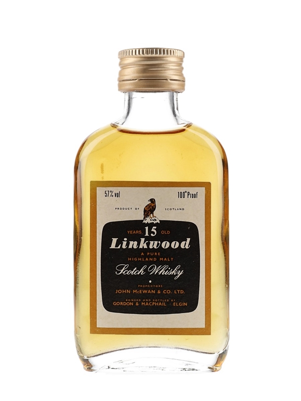 A miniature bottle of Linkwood 15 Year Old 100° Proof a Pure Highland Malt Scotch Whisky, bonded and bottled by Gordon & MacPhail. We estimate this was bottled in the late 1970s to 1980s.