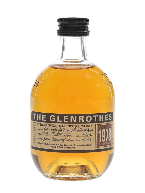 A 10cl bottle of The Glenrothes 1978 Single Malt Scotch Whisky. This was distilled in 1978 and bottled in 2008. The label describes the character of the whisky: Rich vanilla, fruit compote, intense spice.