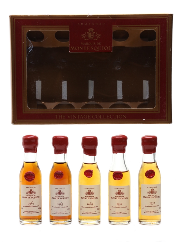 The Marquis de Montesquiou Vintage Collection contains five miniature bottles of vintage Armagnac: