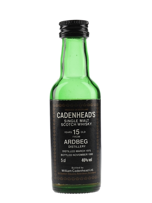 A miniature bottle of Ardbeg 15 Year Old Single Malt Scotch Whisky. This was distilled in March 1975 and bottled in November 1990 by Cadenhead's.