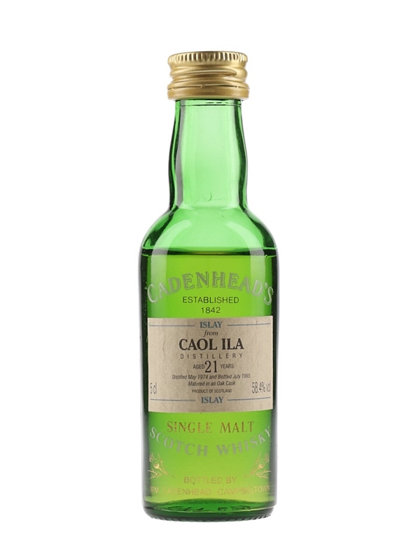 A miniature bottle of Caol Ila 1974 21 Year Old Single Malt Scotch Whisky. This was distilled in May 1974 and bottled in July 1995 by Cadenhead's.