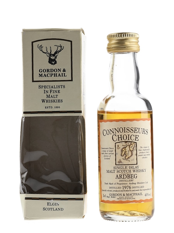 A miniature bottle of Ardbeg 1976 Single Islay Malt Scotch Whisky. This was distilled in 1976 and bottled by Gordon & MacPhail as part of the Connoisseurs Choice series. The bottling code indicates this was bottled in 1990.