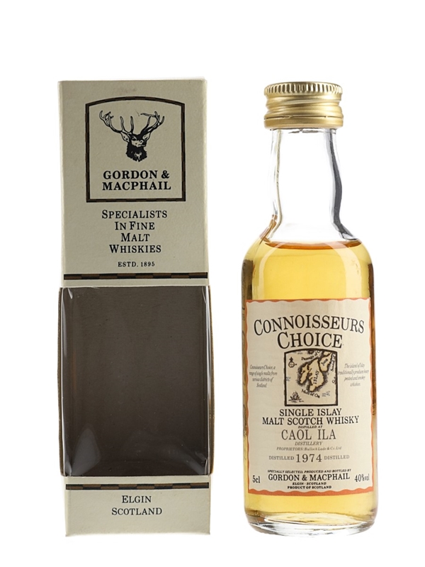 A miniature bottle of Caol Ila 1974 Single Islay Malt Scotch Whisky. This was distilled in 1974 and bottled by Gordon & MacPhail as part of the Connoisseurs Choice series. We estimate this was bottled in the 1980s to 1990s.