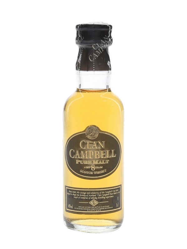 A miniature bottle of Clan Campbell 8 Year Old Pure Malt Scotch Whisky, distilled, matured and bottled by Muir Mackenzie & Co. Ltd.