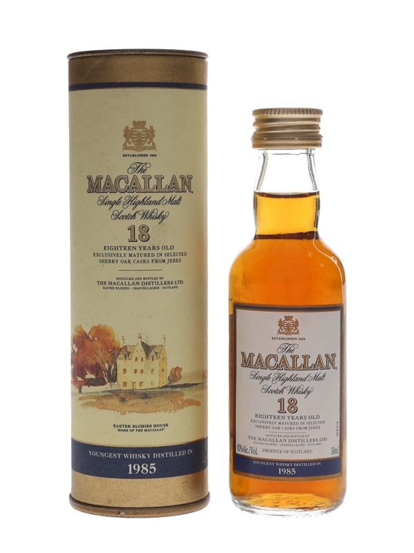A miniature bottle of The Macallan 18 Year Old Single Highland Malt Scotch Whisky. This was made from sherry matured malts, with the youngest whisky distilled in 1985. This was bottled for the US market and imported by Rémy Amerique.