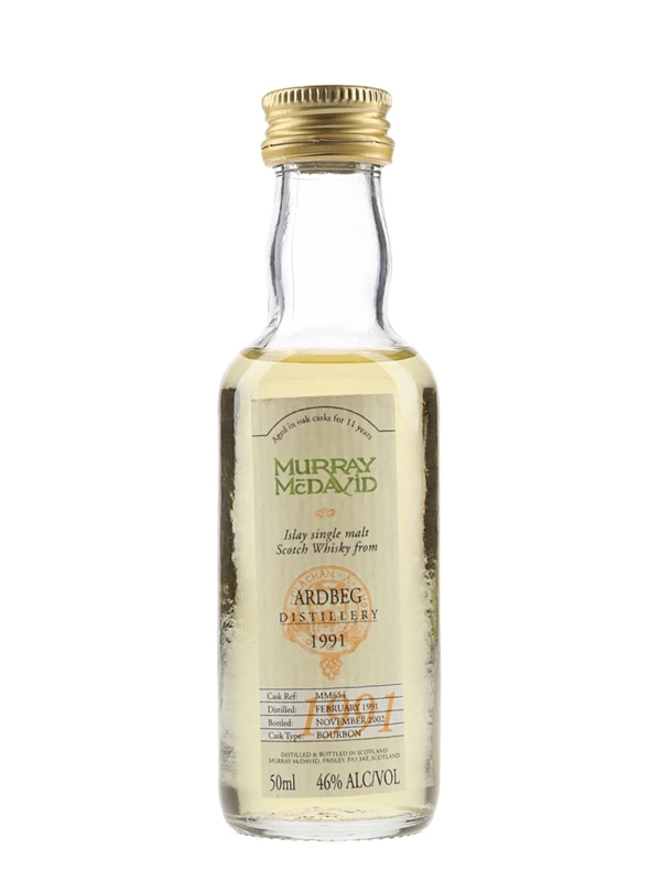 A miniature of Ardbeg 1991 Islay Single Malt Scotch Whisky. This was distilled in February 1991, matured in a single bourbon barrel and bottled in November 2002 by Murray McDavid.