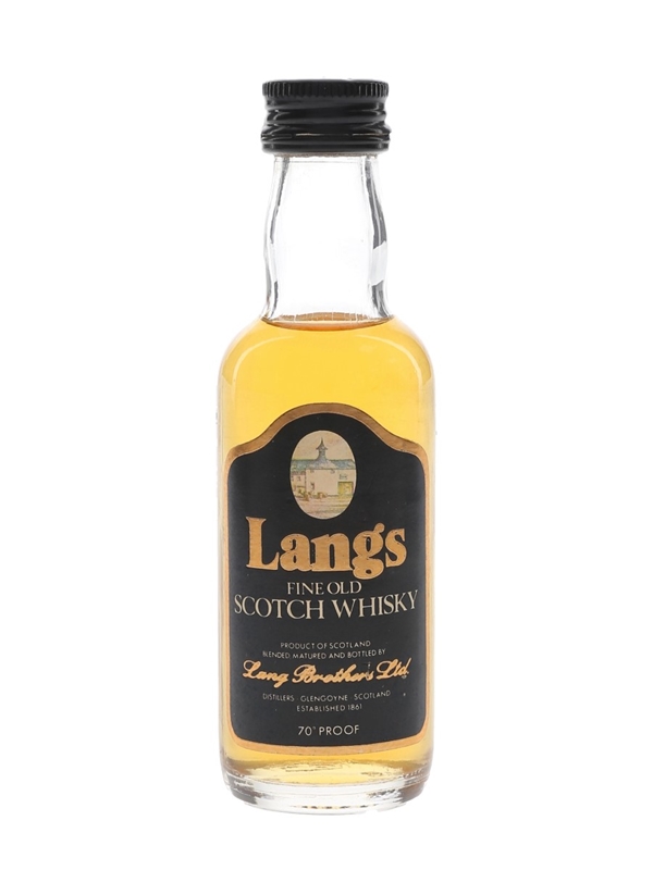 A miniature bottle of Langs Fine Old Scotch Whisky, blended, matured and bottled by Lang Brothers Ltd. We estimate this was bottled in the 1970s.