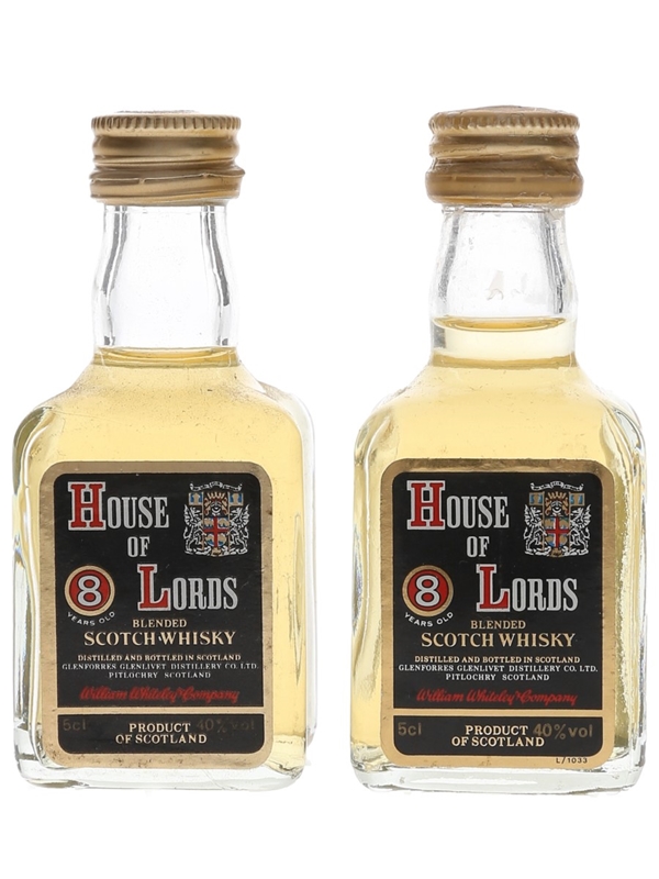 This lot contains two miniature bottles of House of Lords 8 Year Old Blended Scotch Whisky produced by William Whiteley & Co., Glenforres Glenlivet Distillery Co. Ltd. We estimate these were bottled in the 1980s.