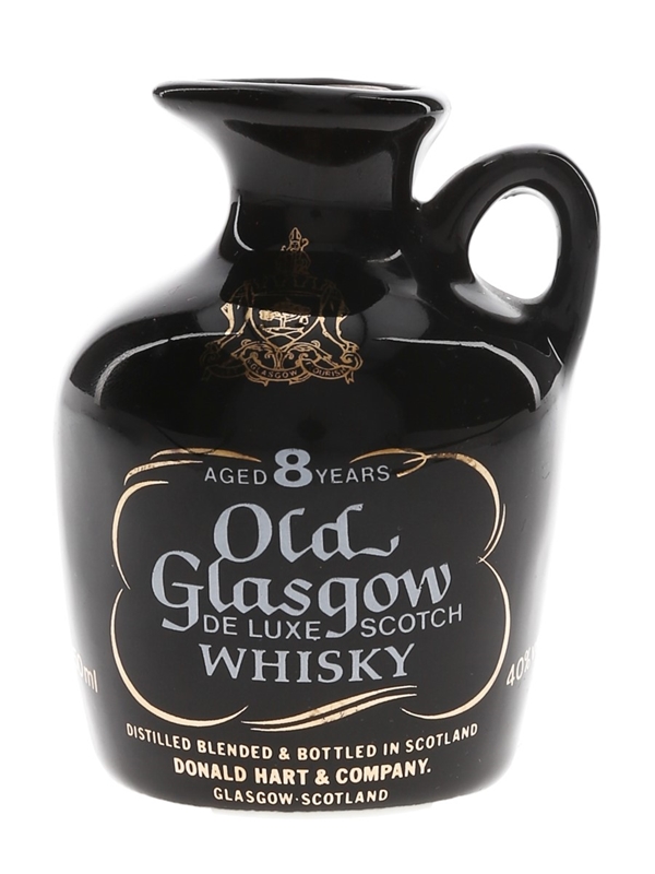 A miniature ceramic decanter of Old Glasgow 8 Year Old De Luxe Scotch Whisky. this was distilled, blended and bottled by Donald Hart & Company. This is presented in a black decanter and contains A Personal Message From The Lord Provost Of Glasgow. We estimate this was bottled in the 1980s.