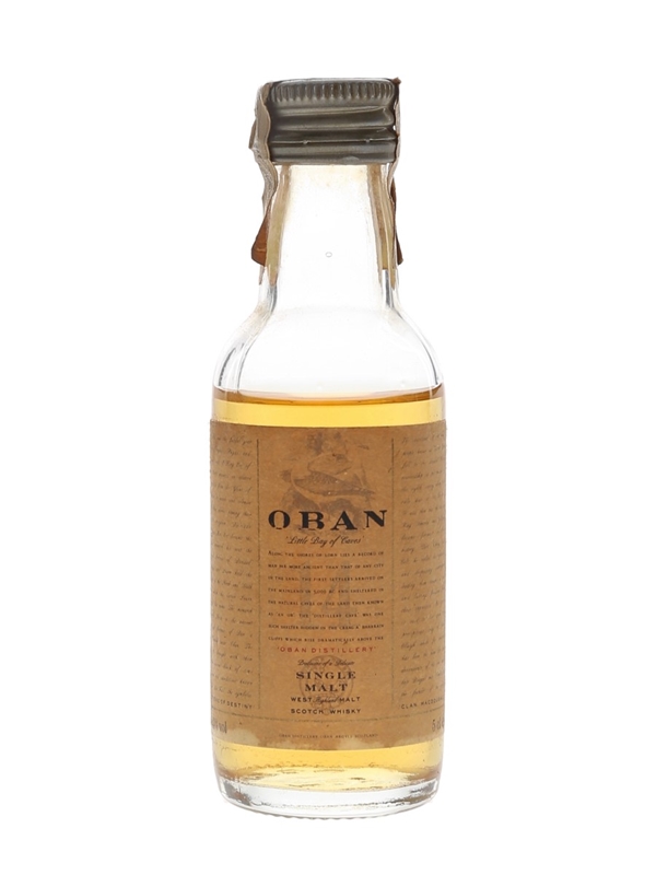A miniature bottle sof Oban 14 Year Old Single Malt Scotch Whisky, the Western Highland representative in Diageo's Classic Malts range.