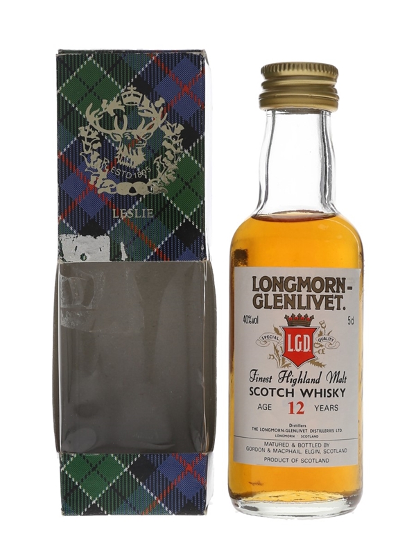 A miniature bottle of Longmorn-Glenlivet 12 Year Old Finest Highland Malt Scotch Whisky, bottled by Gordon & MacPhail. The bottling code indicates this was bottled in 1996.