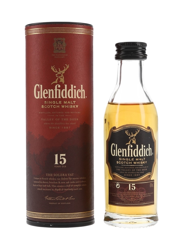 A miniature bottle of Glenfiddich 15 Year Old Single Malt Scotch Whisky. The spirit is matured in three different cask types: bourbon, sherry, and new oak, before marrying in a large hand-made cask called a solera vat.