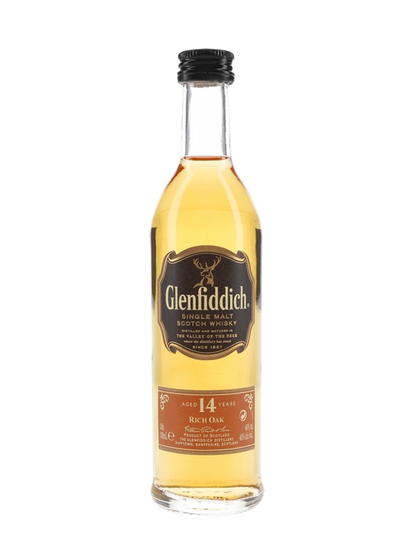 A 10cl bottle of Glenfiddich Rich Oak 14 Year Old Single Malt Scotch Whisky, first released in spring 2010. This spent 14 years in ex-bourbon casks before two separate finishes of 12 weeks in new Spanish oak and six weeks in new American oak before bottling.