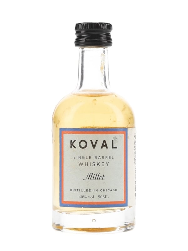 A miniature bottle of Koval Millet Single Barrel Whiskey. This was distilled by Koval Inc., Chicago, and bottled for the German importer Haromex Development GmbH.