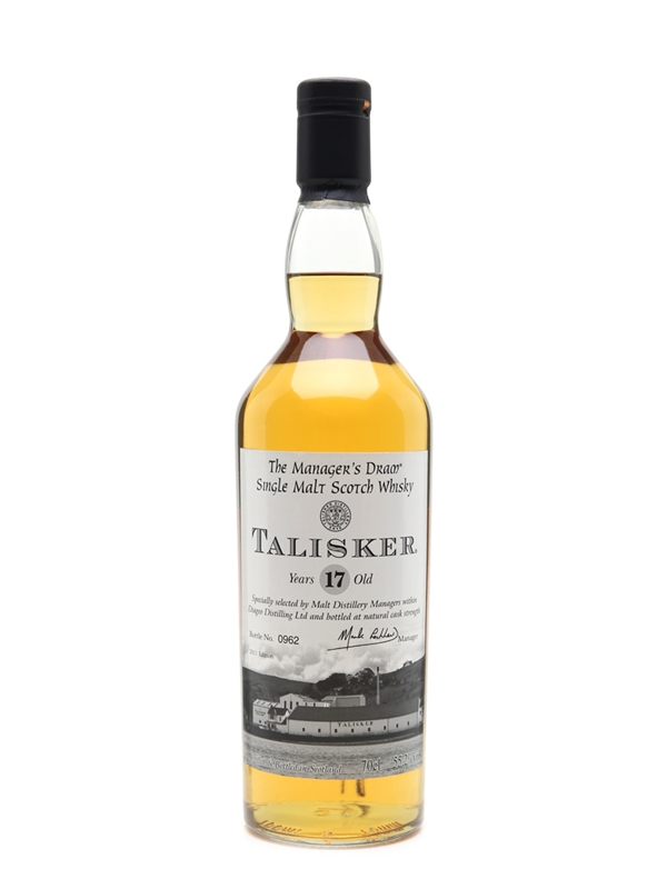A bottle of Talisker 17 Year Old, selected by the Diageo distillery managers and released as part of the Manager's Dram series and originally given to friends and employees of the distillery and not openly sold to the public.