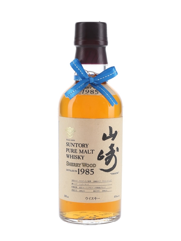 An 18cl bottle of Suntory Pure Malt Whisky, distilled in 1985 at Yamazaki distillery, matured in sherry wood, and bottled at 45% ABV in 2000.