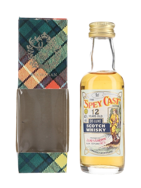 A miniature bottle of Spey Cast 12 Year Old De-Luxe Scotch Whisky, produced by James Gordon & Co. The bottling code indicates this was bottled in 1989.