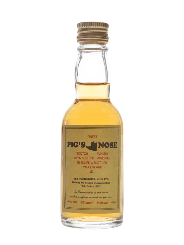A miniature bottle of Pig's Nose Finest Scotch Whisky, blended and bottled in Scotland for MJ Dowdeswell & Co. Ltd. We estimate this was bottled in the 1970s.