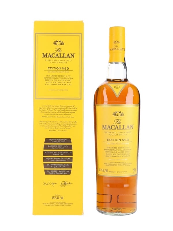 A bottle of Macallan Edition No.3, a limited edition single malt matured in six distinct cask types. This whisky was created in conjunction with Master Perfumer Roja Dove. This was bottled for the US market.