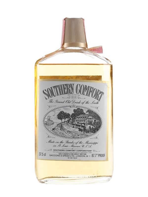 A 37.5cl bottle of Southern Comfort, The Grand Old Drink of the South. This was bottled at 50% ABV for the UK market and distributed by Saccone & Speed Ltd, we estimate in the 1970s.