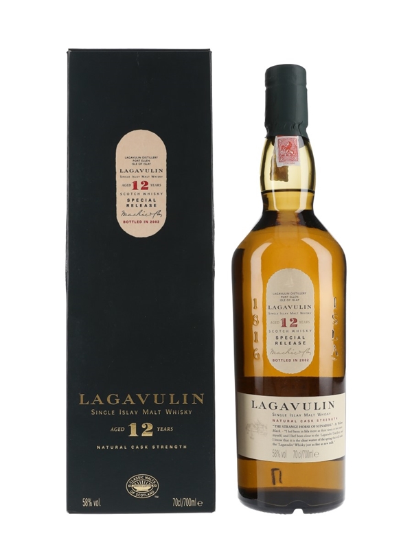 A bottle of Lagavulin 12 Year Old Single Islay Malt Whisky, released in 2002 for Diageo's annual Special Releases series. This was bottled at a natural cask strength of 58% ABV.