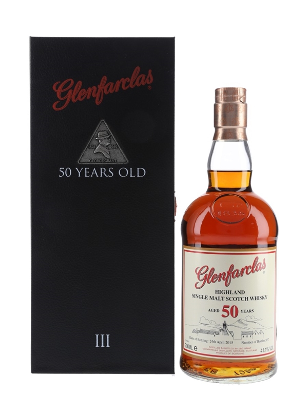 A bottle of Glenfarclas 50 Year Old Highland Single Malt Scotch Whisky, the third release in a series celebrating the Grant family's six generations of ownership. This edition is dedicated to George Grant (1874-1949) who purchased the freehold of the distillery outright in 1930, after vowing never to rely on outside investors.