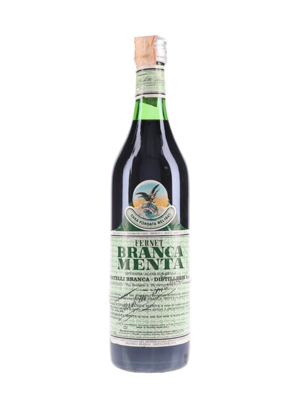 A bottle of Fernet Branca Menta, a mint liqueur produced by Fratelli Branca. The label states this was bottled in 1972.