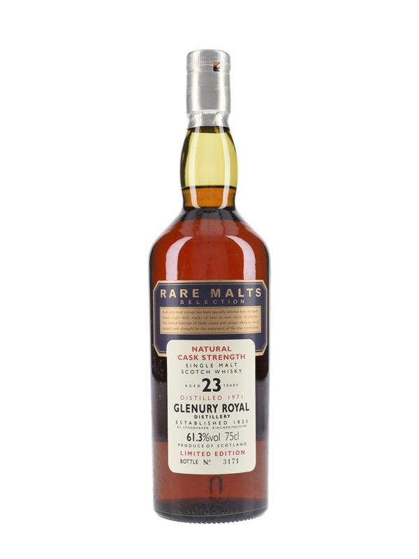 A bottle of Glenury Royal 23 Year Old Single Malt Scotch Whisky. This was distilled in 1971 and bottled for Diageo's now-discontinued Rare Malts Selection.