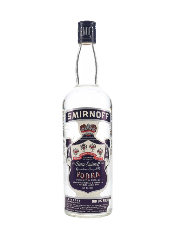 A bottle of Smirnoff Blue Label Vodka, produced in England and bottled at 100 Proof.