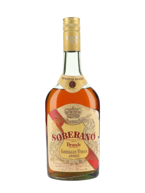 A bottle of Soberano Brandy produced in Jerez, Spain, by Gonzalez, Byass. This was bottled for the Italian market and imported by Wax & Vitale, we estimate in the 1980s to 1990s