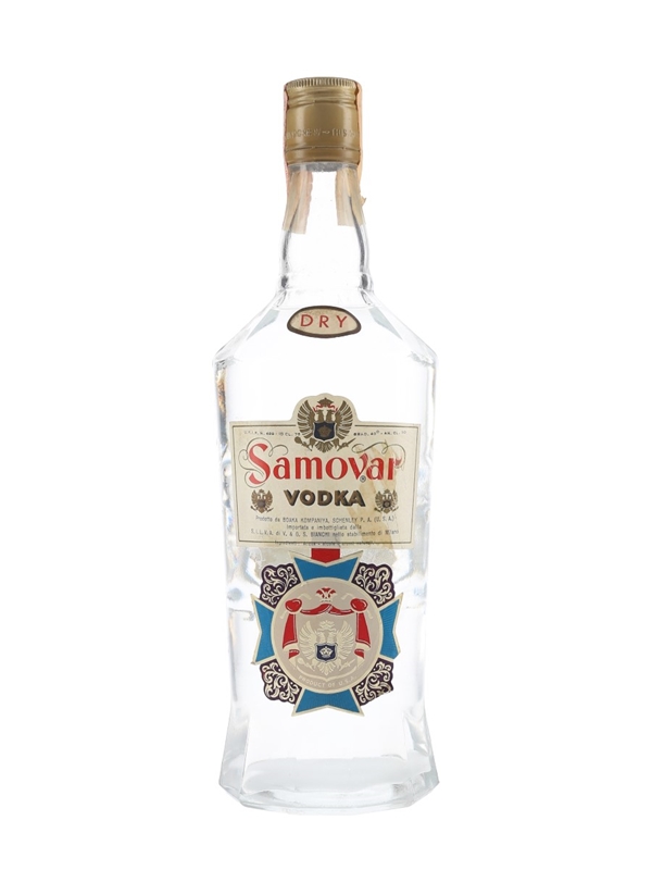 A bottle of Samovar Dry Vodka, produced in the US by Schenley and bottled in Italy by Silva. We estimate this was bottled in the 1960s to 1970s.