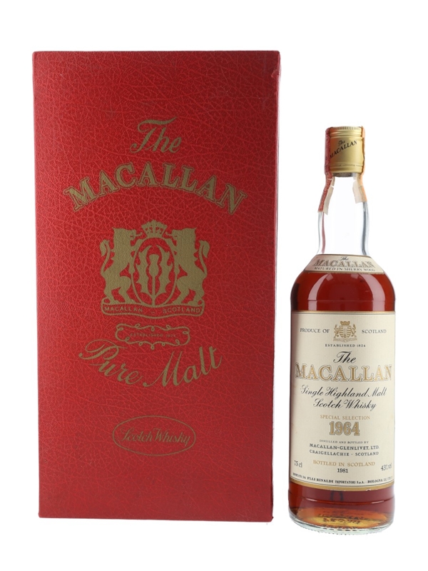 A bottle of The Macallan Single Highland Malt Scotch Whisky. This was distilled in 1964, matured in sherry casks and bottled in 1981 at 43% ABV. This was imported to the Italian market by Rinaldi.