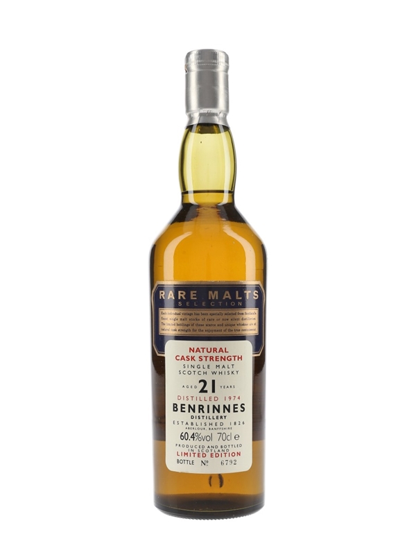 A bottle of Benrinnes 21 Year Old Single Malt Scotch Whisky. This was distilled in 1974 and bottled for Diageo's Rare Malts Selection range.