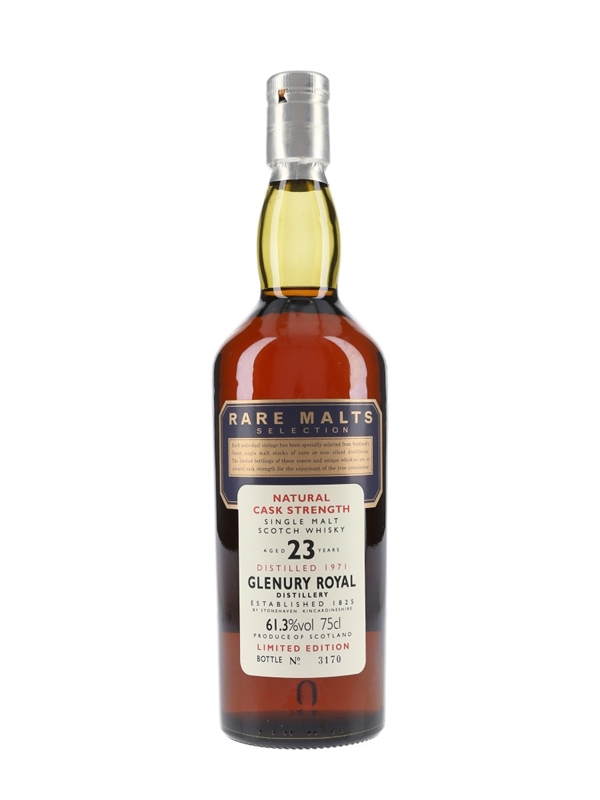 A bottle of Glenury Royal 23 Year Old Single Malt Scotch Whisky. This was distilled in 1971 and bottled for Diageo's now-discontinued Rare Malts Selection.