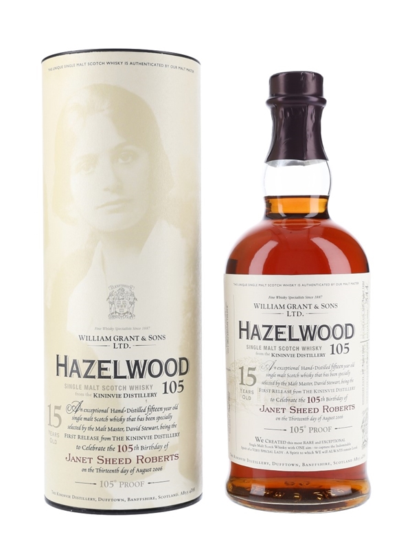 A bottle Hazelwood 105 Single Malt Scotch Whisky. This was distilled at Kininvie distillery on 9 August 1990, matured in first fill sherry casks for 15 years and bottled on 1 August 2006 by William Grant & Sons.