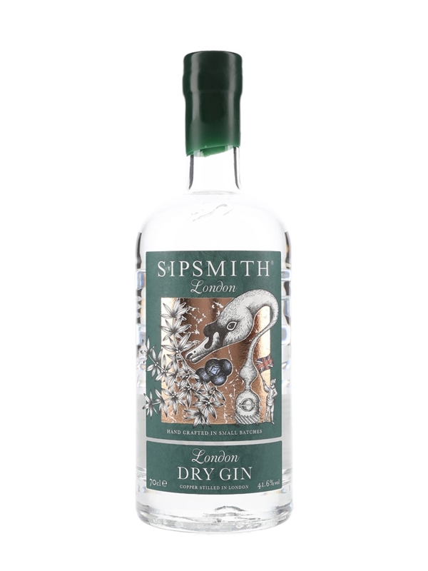 A bottle of Sipsmith London Dry Gin, produced in London from English barley spirit and 10 selected botanicals.